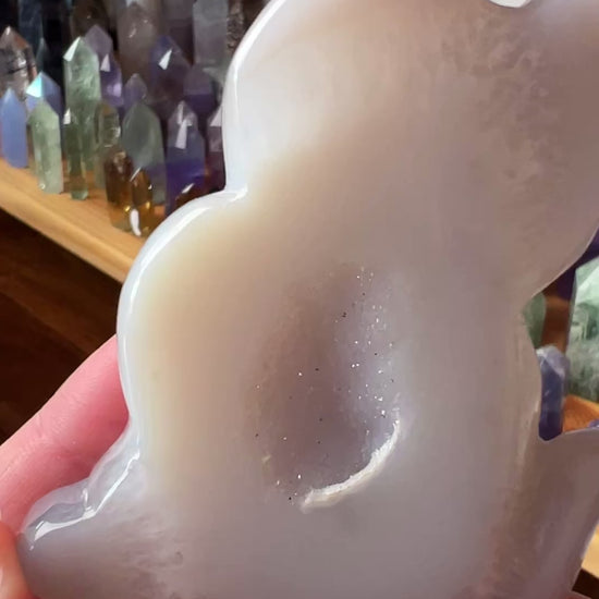 hand carved Agate kitty / beautiful light grey and white colouration with a gorgeous sparkling sugar druzy pocket on the front / cannot self stand, best display flat or on a stand / would make a beautiful gift for the crystal or cat lover looking for that unique piece