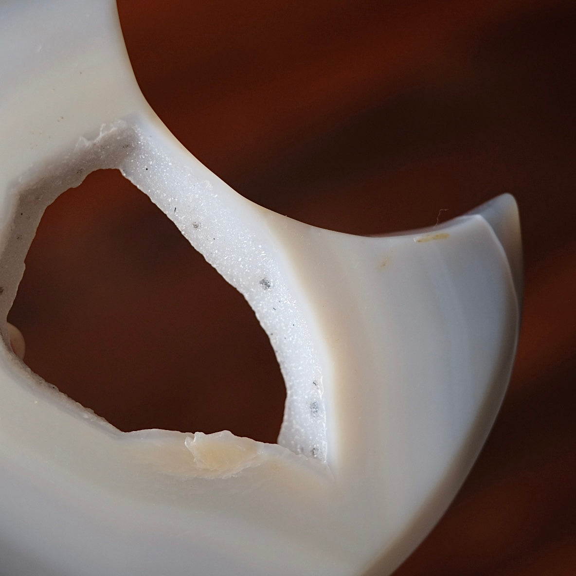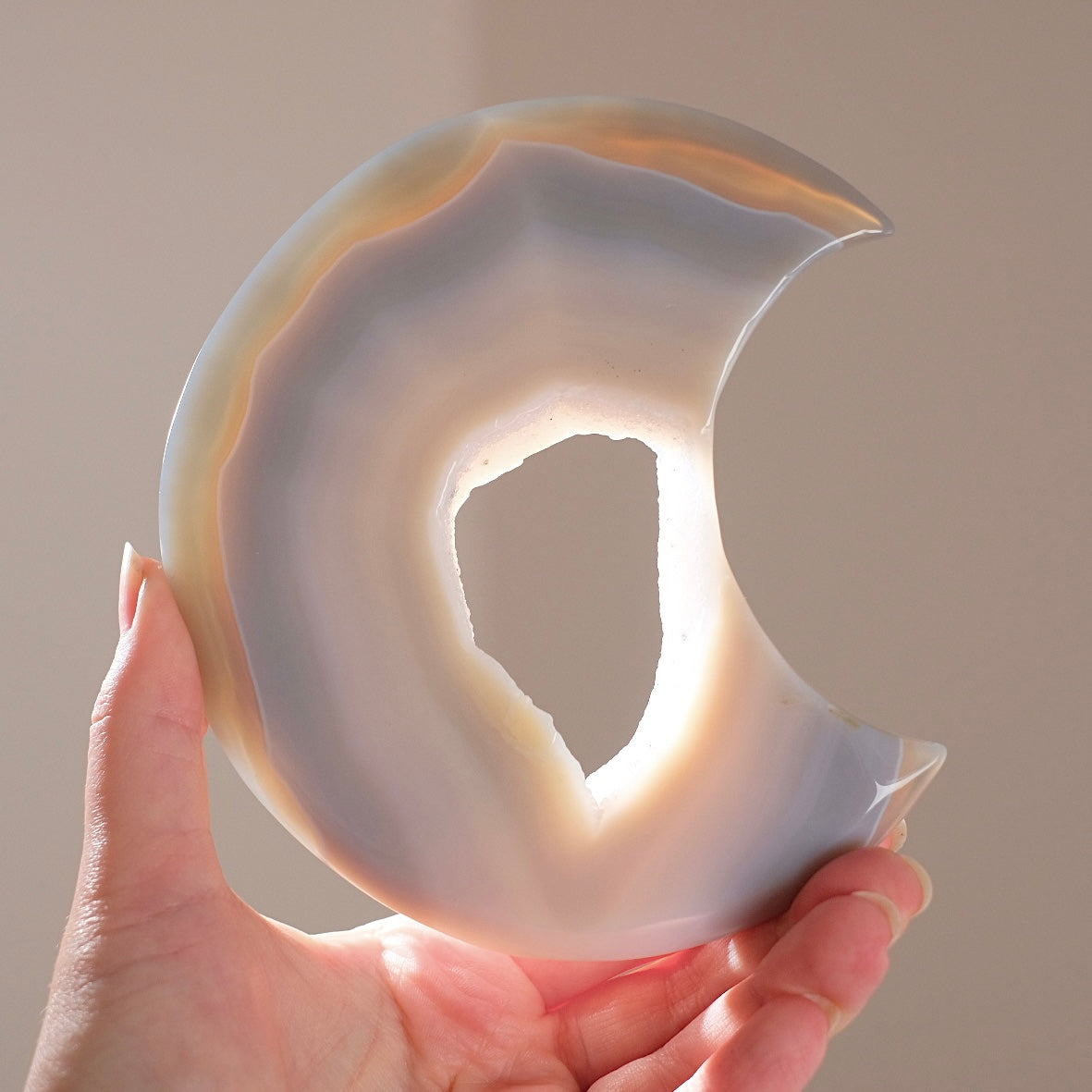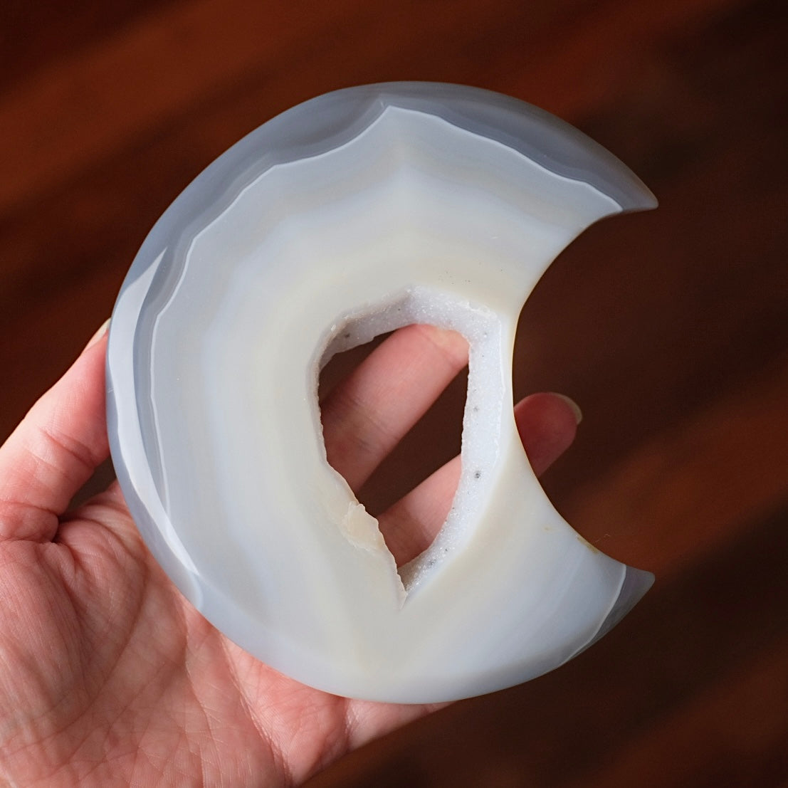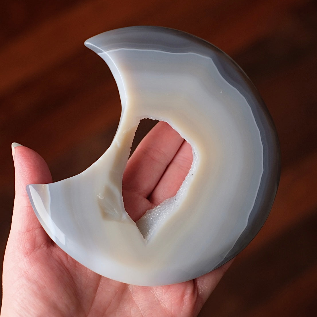 crescent moon shape / the outside is semi translucent when held up to the light giving a lovely glowing effect / beautiful grey coluration in various hues with banding patterns, and a sugar geode in the middle / glossy polished finish, however please