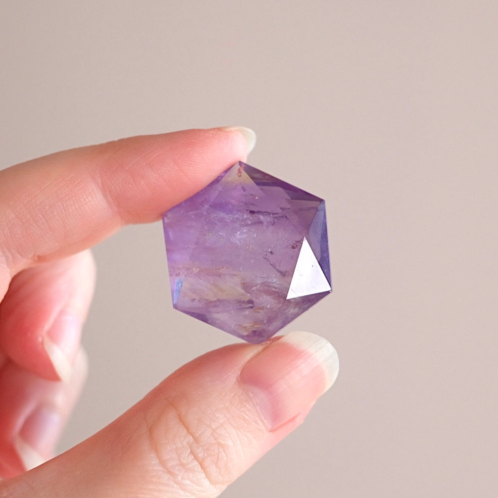 faceted sacred geometry gem stone / sparkles beautifully in the light due to the faceted sides all over, the photos never do these justice! / beautiful purple colouration, it even has some faint hints of Citrine inclusion, so is technically Ametrine! / glossy polished finish
