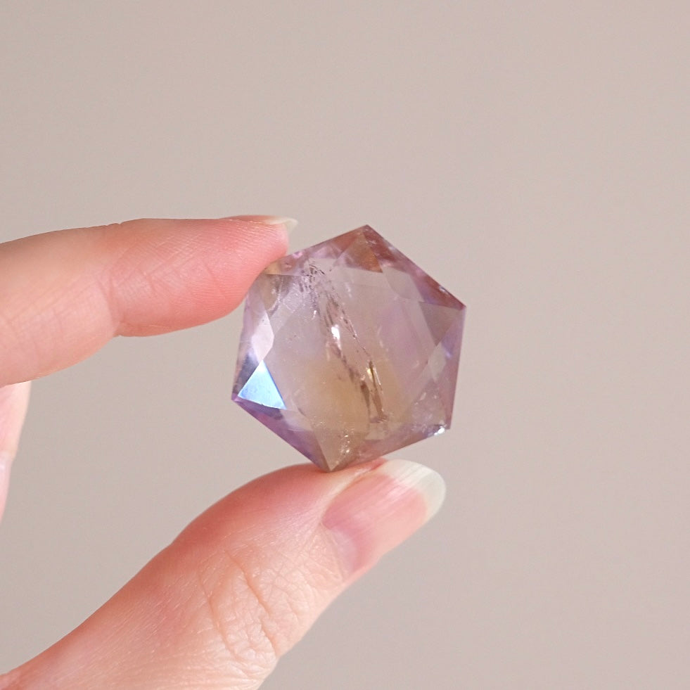 faceted sacred geometry gem stone / sparkles beautifully in the light due to the faceted sides all over, the photos never do these justice! / beautiful light purple colouration with phantom Citrine zoning / glossy polished finish
