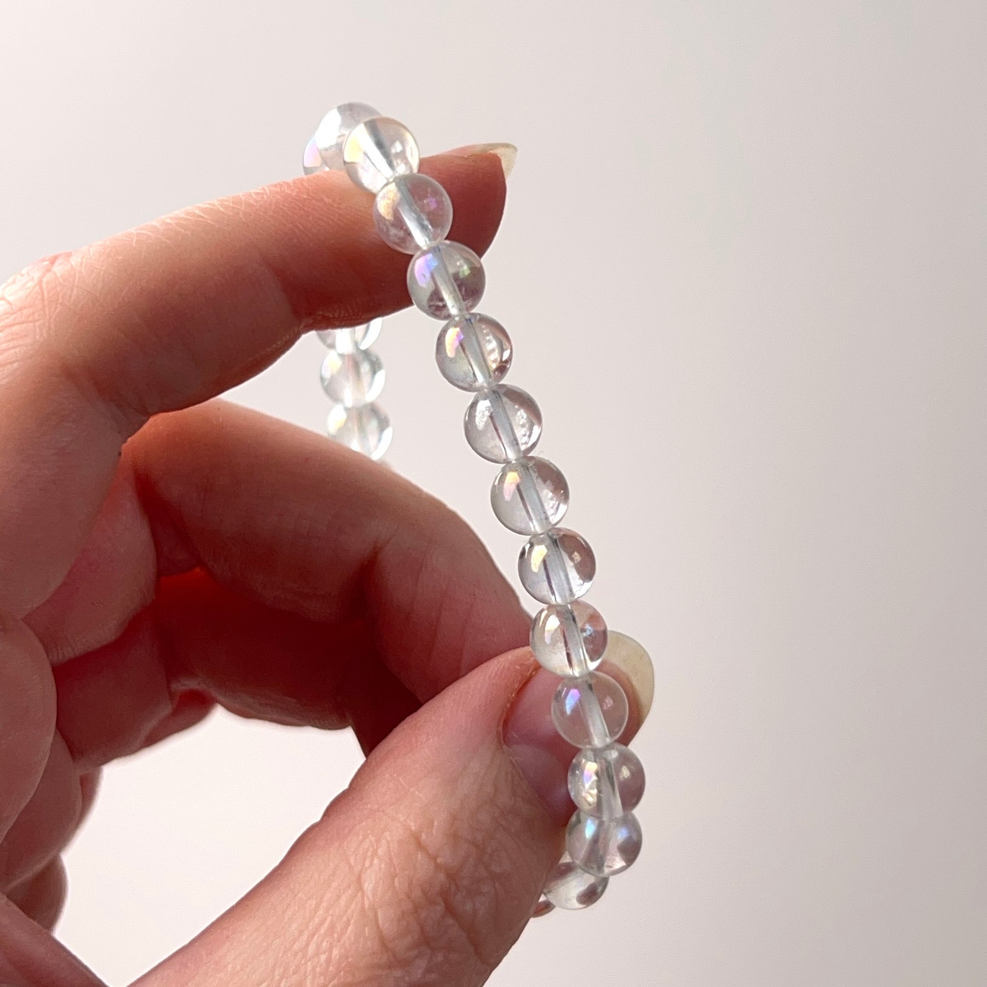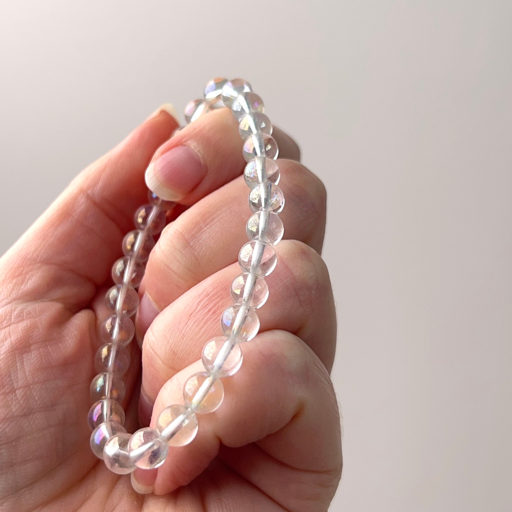 beautiful Clear Quartz with Angel Aura rainbow coating / bead size is approx 6.5mm / one size fits most, up to approx 7 inches (18cm) / polished finish / please avoid wearing in water or when using cleaning chemicals as this may prematurely degrade the stretch cord - with proper care they will last many many years! :)