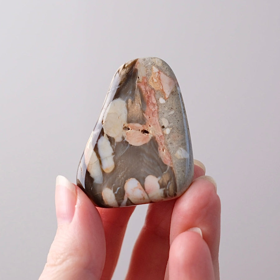 lovely locally mined collectors piece / organically shaped palm or freeform type touch stone / gorgeous earthy tones with wonderful patterning / glossy polished finish, please allow for natural surface features