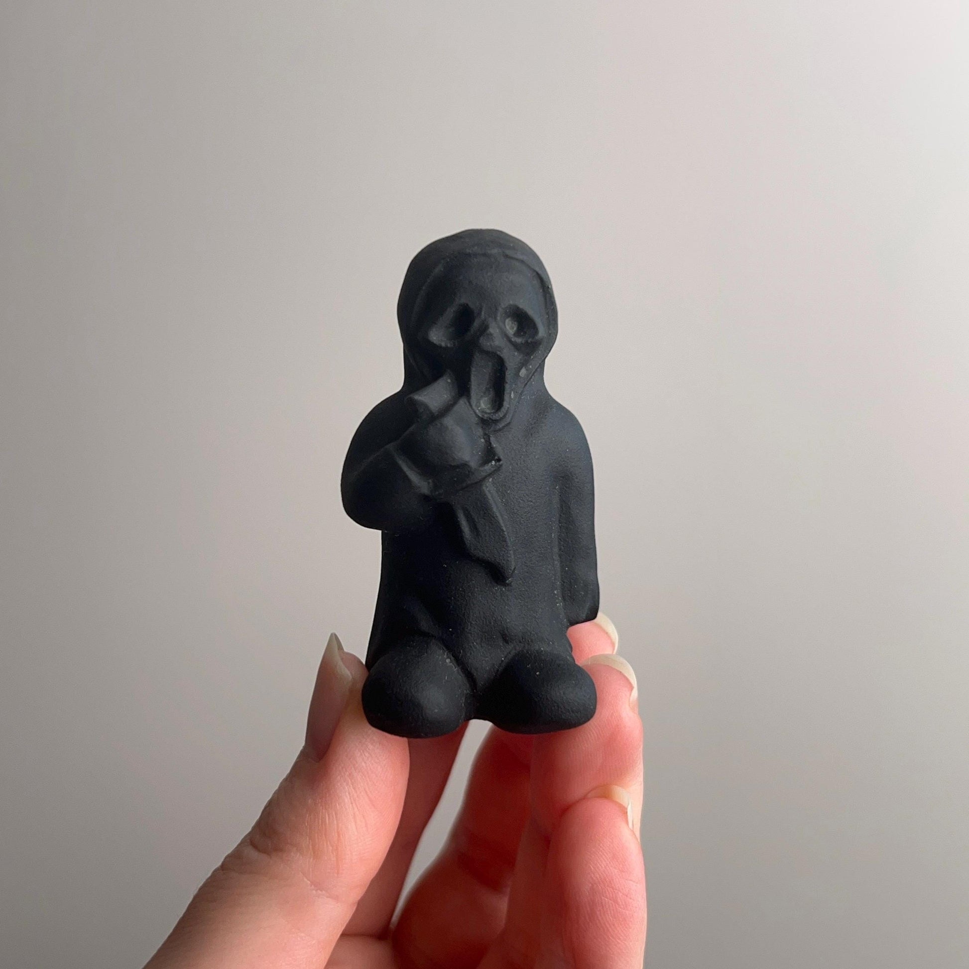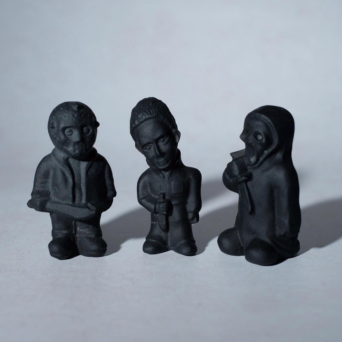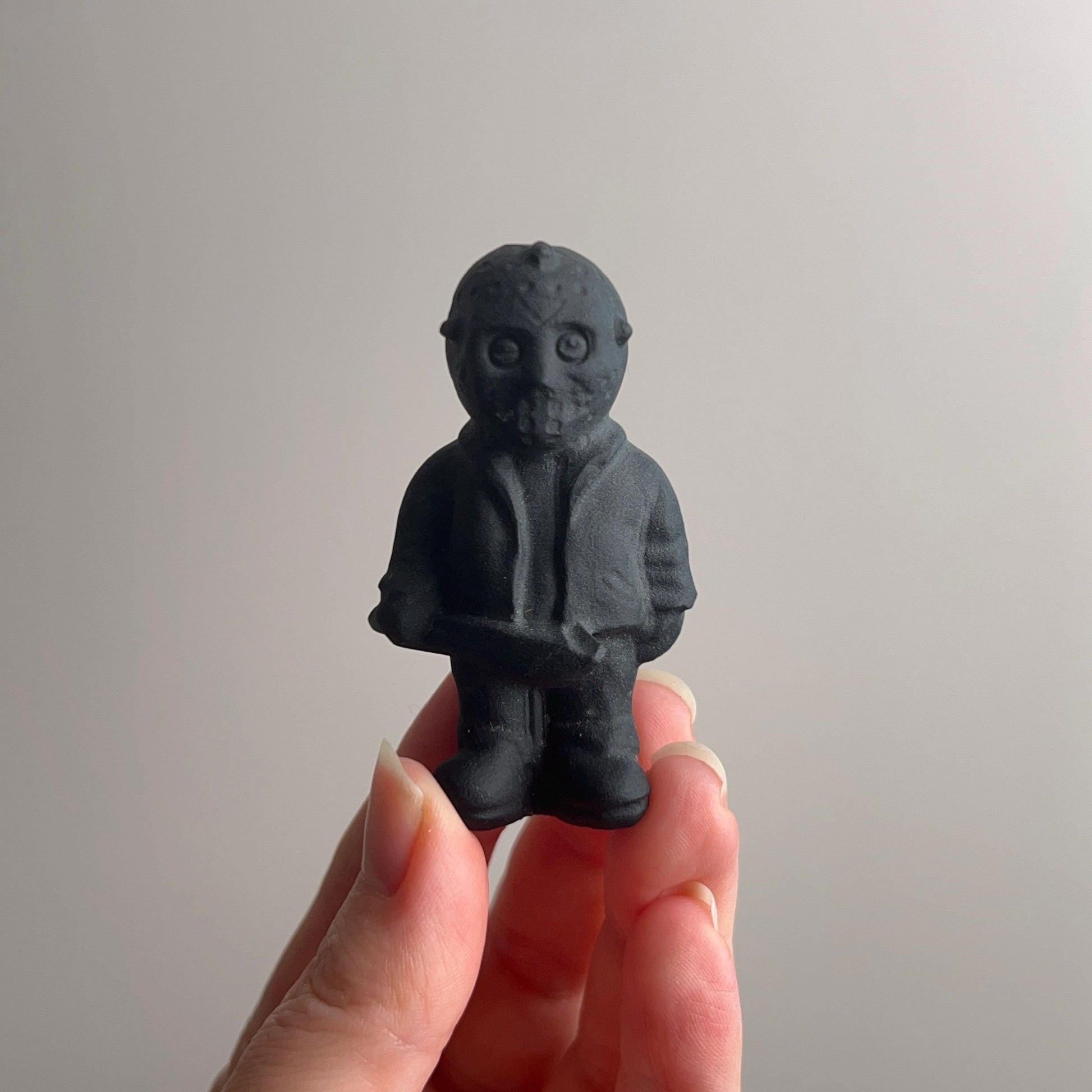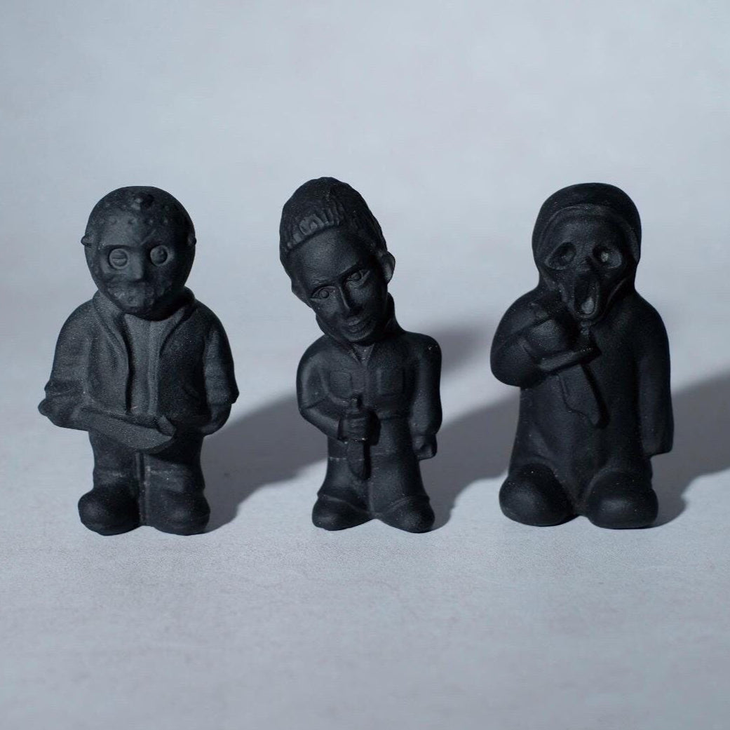 choose from 3 fan favorite killers; , Jason Voorhees (Friday 13th), Michael Myers (Halloween) or Ghostface (Scream) / carved in a cute cartoon type design / awesome gift for any horror fan! / matte black colouration / self standing / there is one Michael available at a discounted price due to a teeny tiny chip on his nose