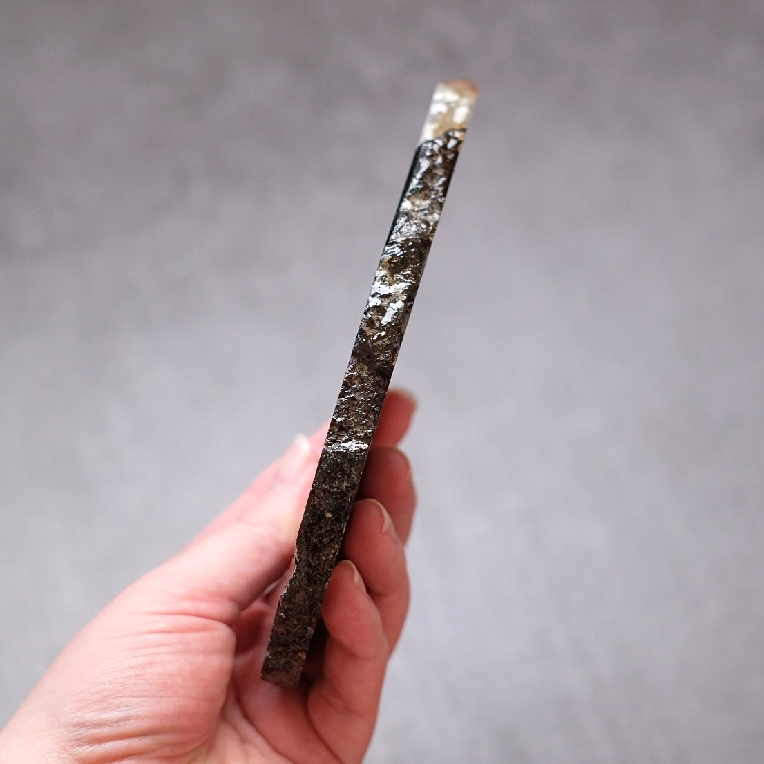 a beautiful polished slice, a stunning mix of deep red carnelian, white Quartz, and blue-grey Carnelian + Agate - much prettier in person! / is translucent - it looks amazing held up to a light / glossy polished finish on both faces, but with a raw natural edge (edge has been resin coated to help protect them), please note it does have imperfections and small pits etc / comes with the small plastic stand pictured