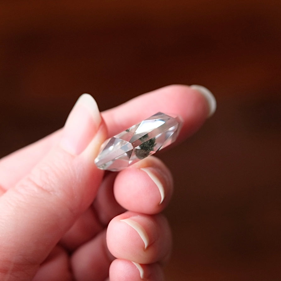 faceted sacred geometry gem stone / sparkles beautifully in the light due to the faceted sides all over, the photos never do these justice! / water Clear Quartz with interesting inclusions of green Chlorite / glossy polished finish