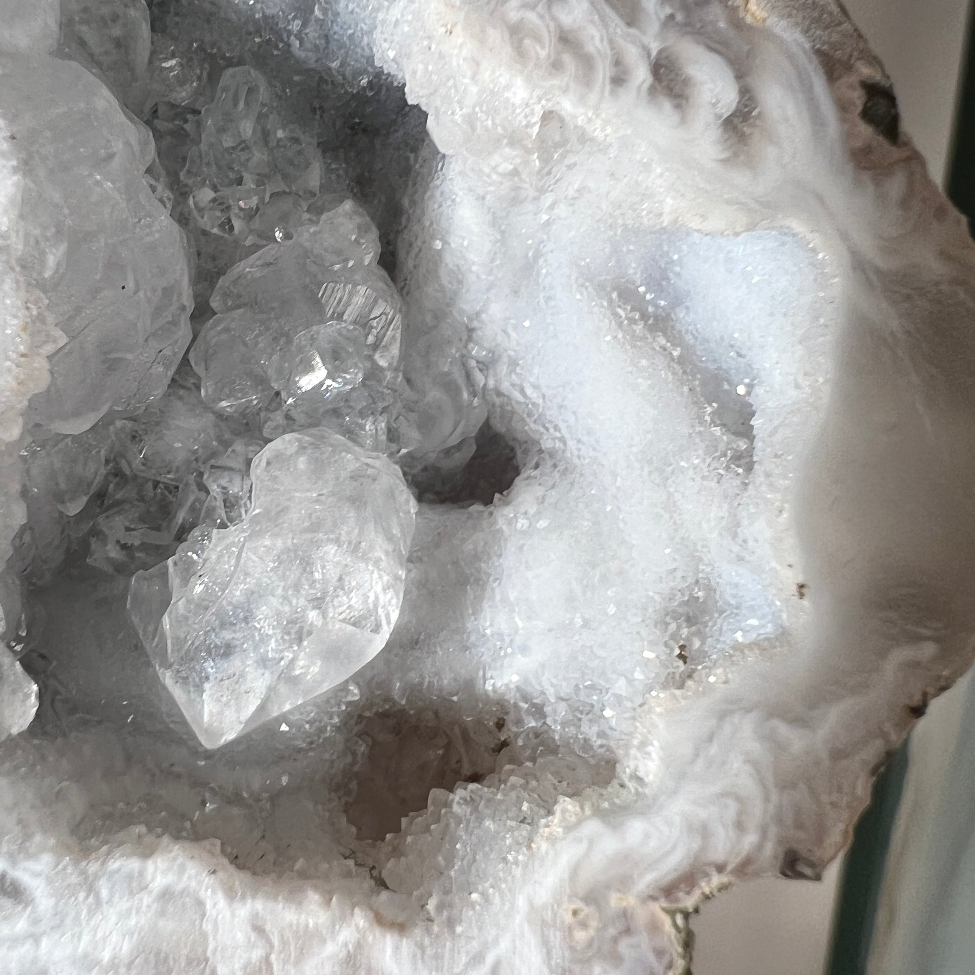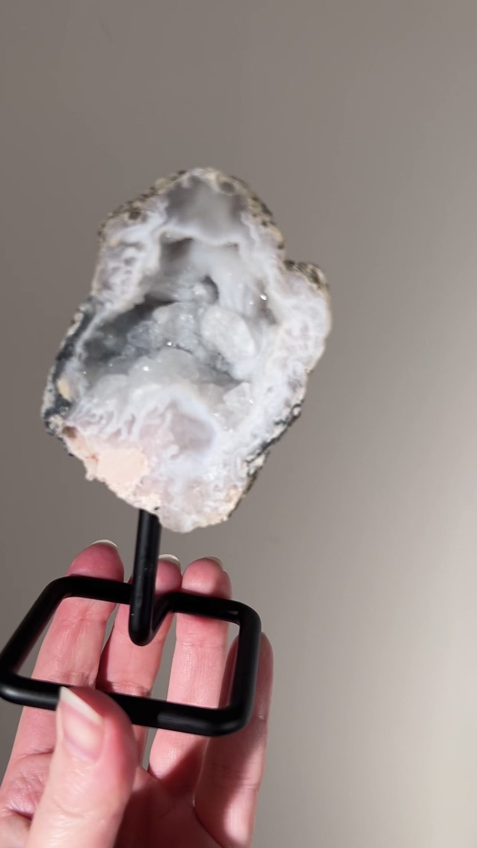 stunning mix of Agate with Quartz formations inside, and super sparkly ‘sugar‘ druzy / the crystal is fixed to the black metal stand ready for display