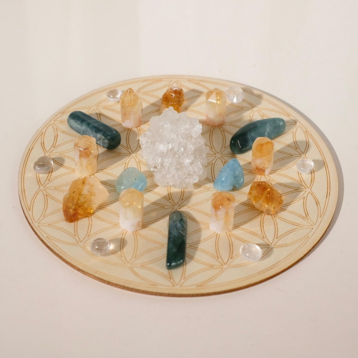 Gridding is a beautiful and intentional way to work with crystal healing by arranging stones in meaningful patterns to amplify focus, clarity, and spiritual intention. Using sacred geometry as a foundation, crystal grids combine the natural properties of crystals with symbolic shapes that help direct and harmonise their influence. A grid can be created for many purposes, such as protection, manifestation, emotional balance, or personal growth, making it a versatile practice for whatever you need on your spiritual path or healing.