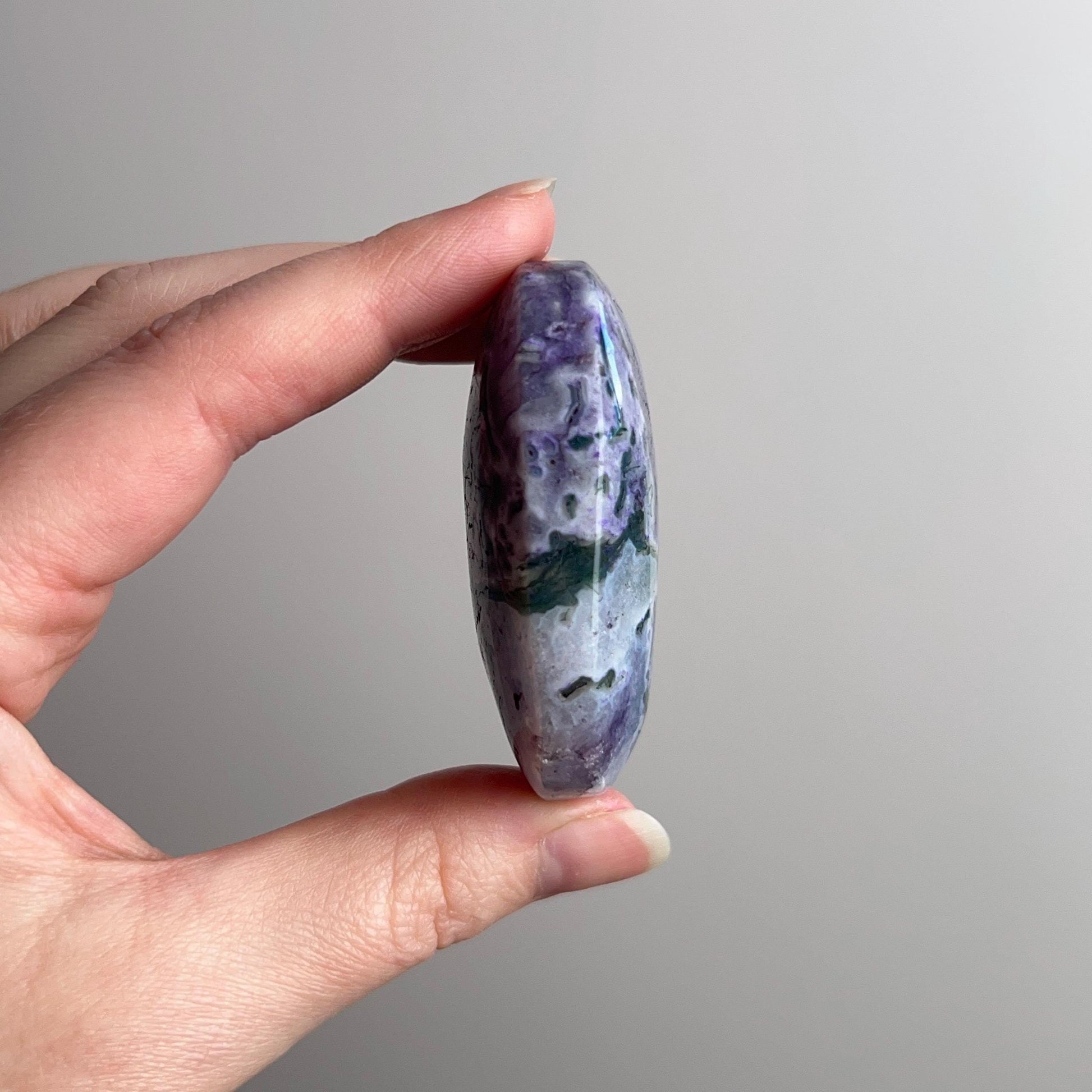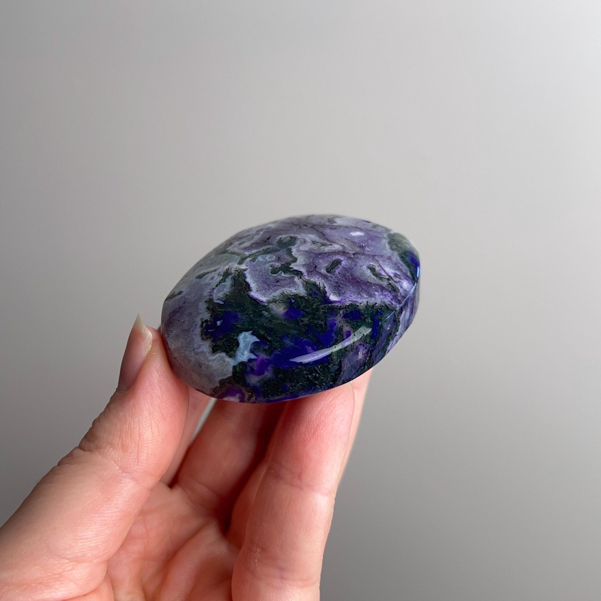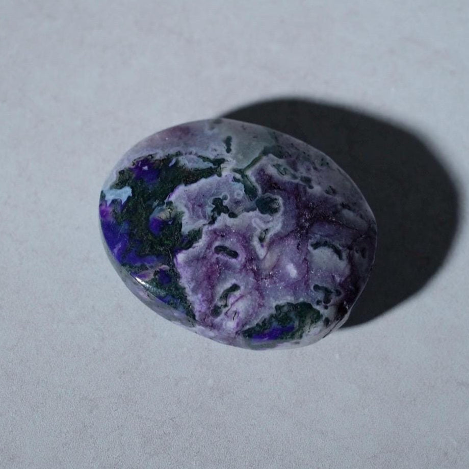 beautiful oval shape with a beveled edge around the circumference / natural Moss Agate with Quartz, which has been dyed a beautiful purple colouration / polished finish, with some natural surface imperfections + pits