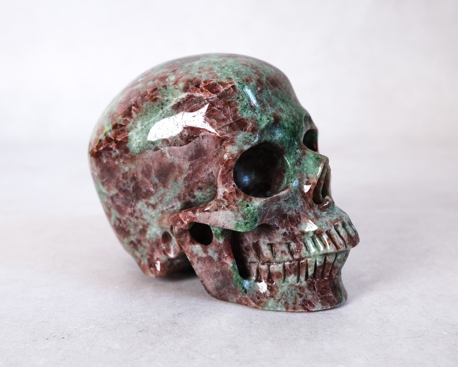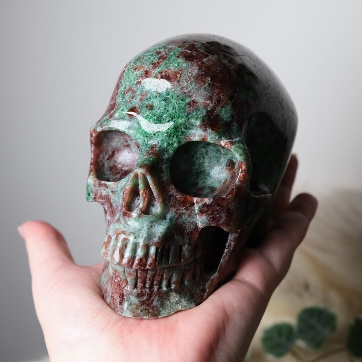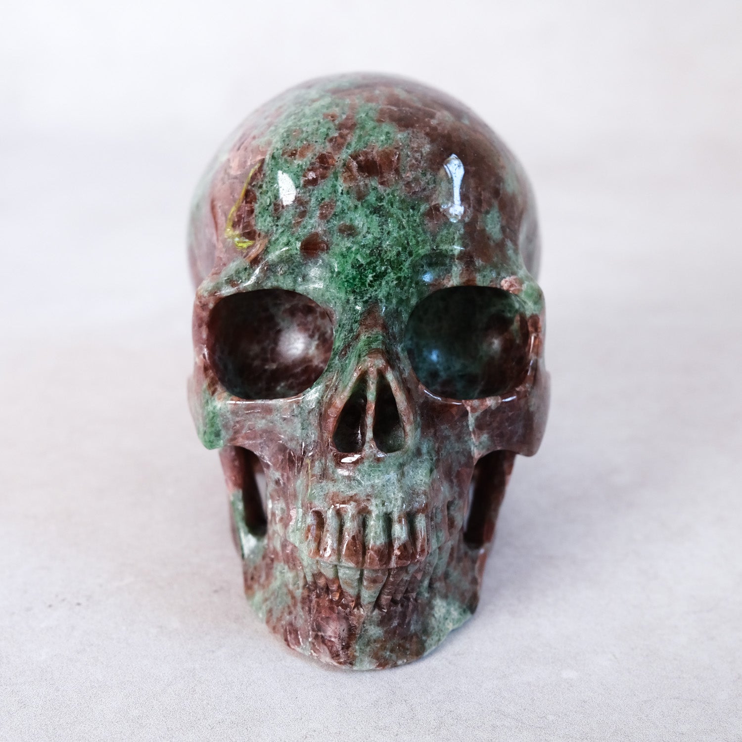 Gorgeous Garnet in Green Omphacite skull, this combination of minerals is also called Eclogite. Often skulls will 'choose' their own caretakers, so if you feel a calling or strong fascination toward a particular one, pay extra attention to those signs. :)