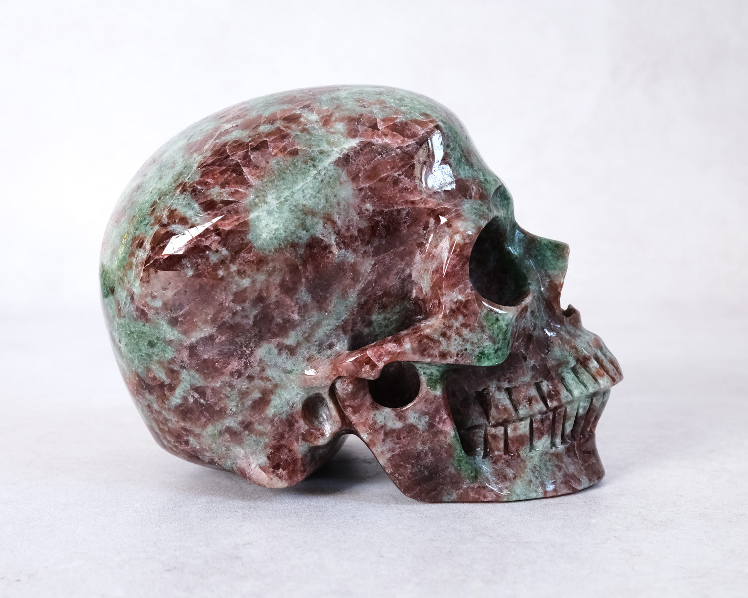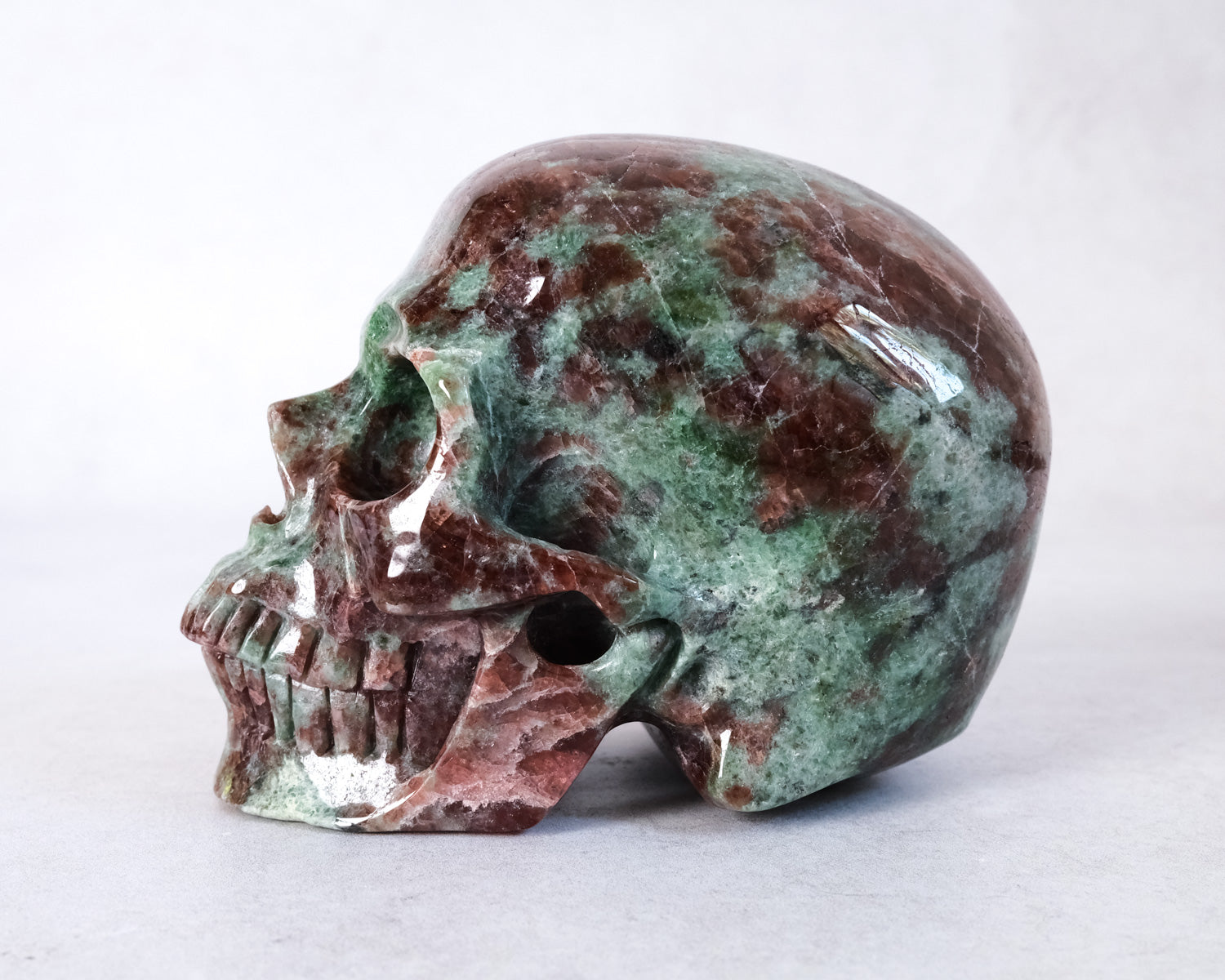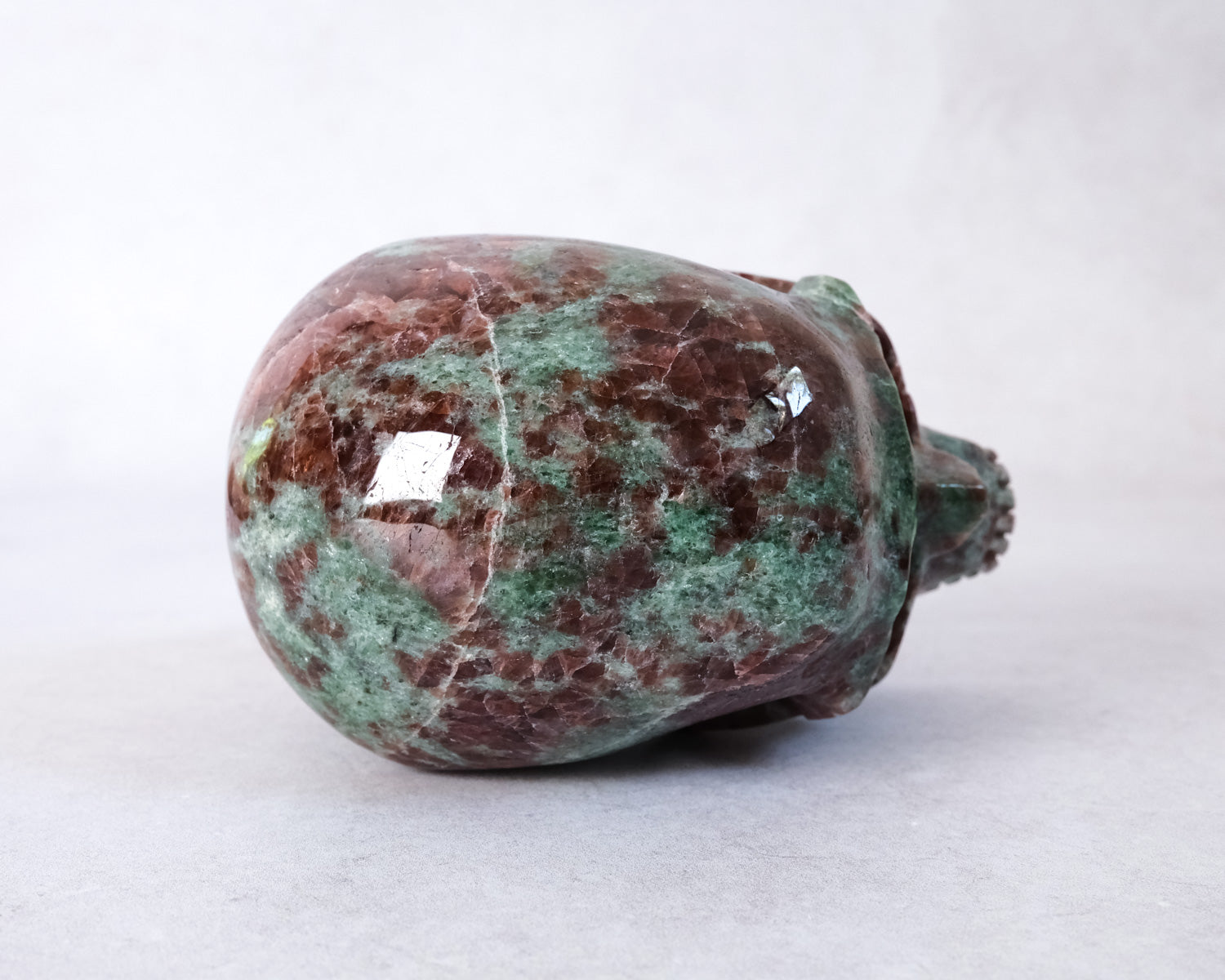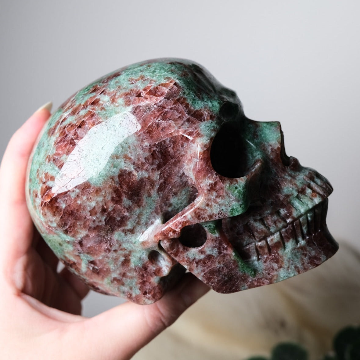 Gorgeous Garnet in Green Omphacite skull, this combination of minerals is also called Eclogite. Often skulls will 'choose' their own caretakers, so if you feel a calling or strong fascination toward a particular one, pay extra attention to those signs. :)