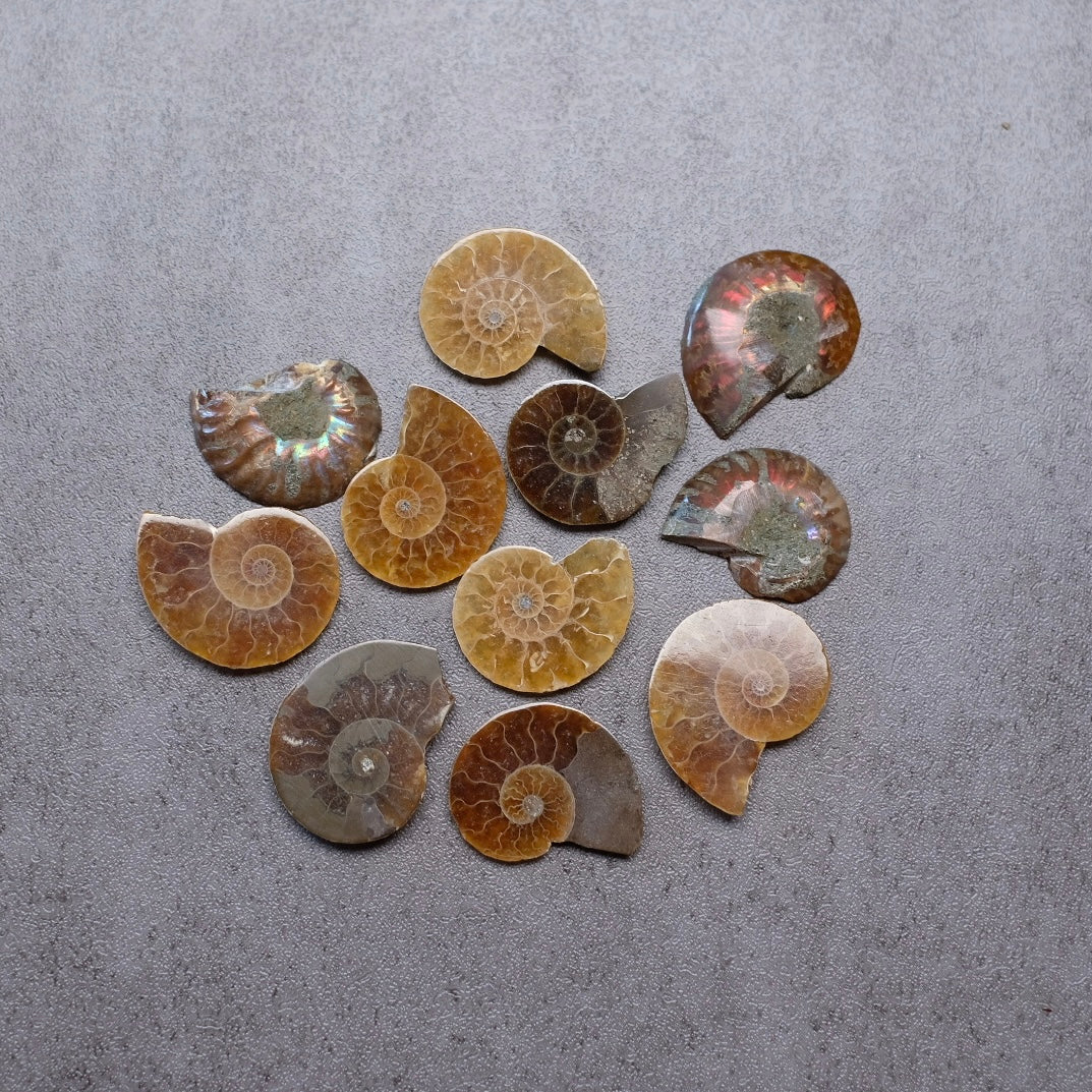 sliced mini Ammonite specimens, with their front faces polished / the backs are raw, and all pieces display hints of rainbow Iridescence / please allow for minor natural imperfections