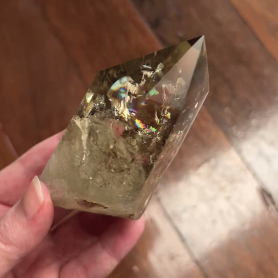 Stunning Smokey Citrine point with custom stand. See video for best view of rainbows!