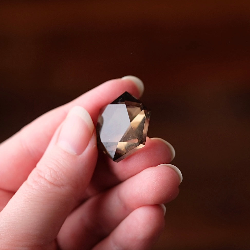 faceted sacred geometry gem stone / sparkles beautifully in the light due to the faceted sides all over, the photos never do these justice! / lovely smokey colouration and super translucent / glossy polished finish