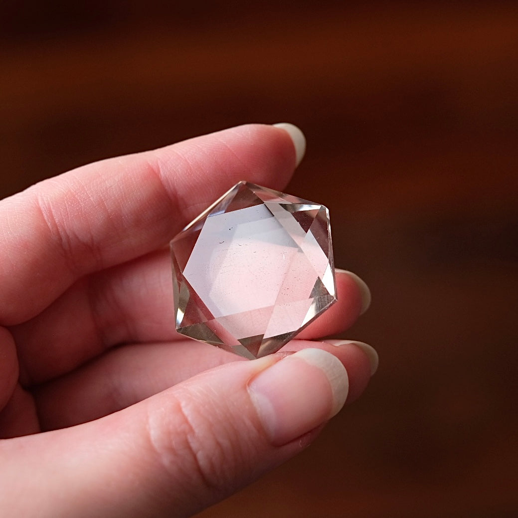 faceted sacred geometry gem stone / sparkles beautifully in the light due to the faceted sides all over, the photos never do these justice! / lovely light smokey colouration, almost clear - and super translucent / glossy polished finish