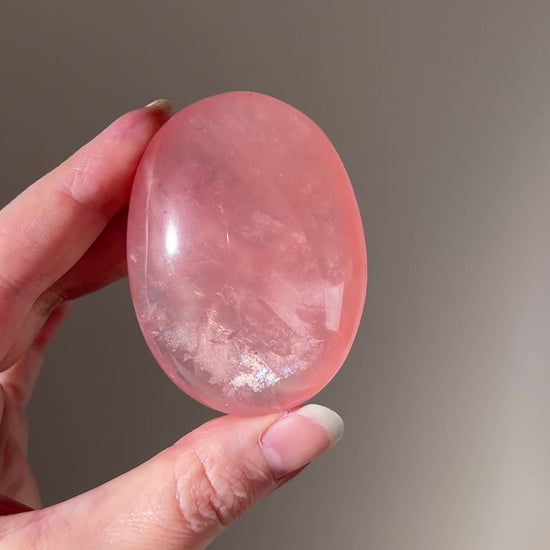 smooth oval shape which is perfect to hold in the hand / beautiful translucent gemmy appearance with lovely peachy pink colouration, and star asterism (star flash) when viewed in bright light / has some internal rainbows / glossy perfectly polished finish