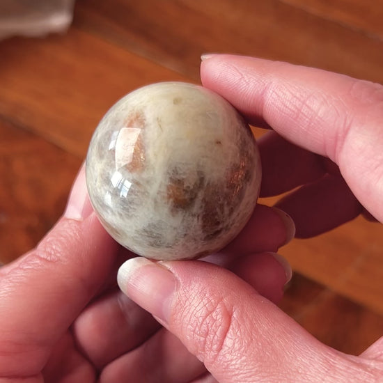 Gorgeous Moonstone x Sunstone sphere! These stones incorporate both blue flash Moonstone with Sunstone schiller inclusions, a wonderful combination.