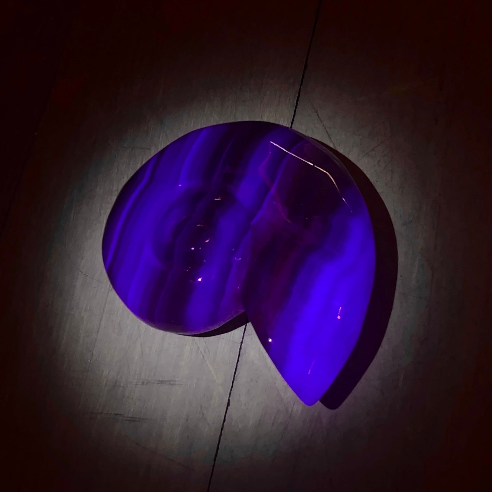 spiral shell or ammonite shape - hand carved from a solid piece of Fluorite from Inner Mongolia / lovely colouration with tones of lavender pink (the yttrium areas), purple, and blue-green, and beautiful banding patterns / appears quite dark indoors, the colours really pop when backlit by a light! / glossy well polished finish